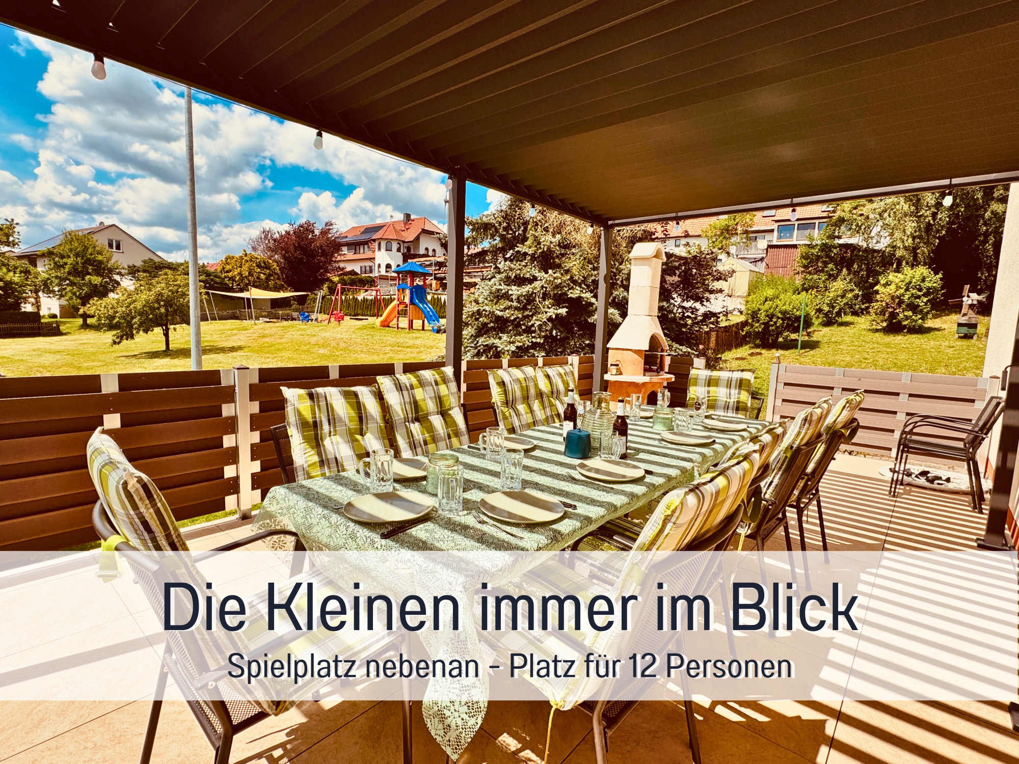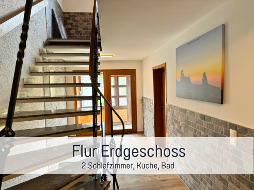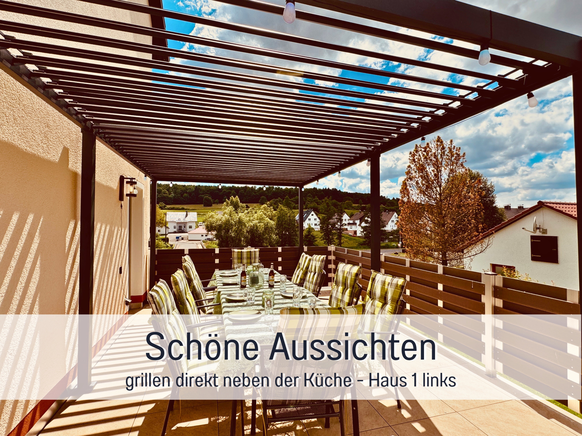Die großzügige Küche grenzt direkt an die überdachte Terrasse, perfekt für gesellige Abende beim Grillen. Von hier aus genießen Sie einen malerischen Blick in den liebevoll gestalteten Garten, der zum Entspannen und Verweilen einlädt.