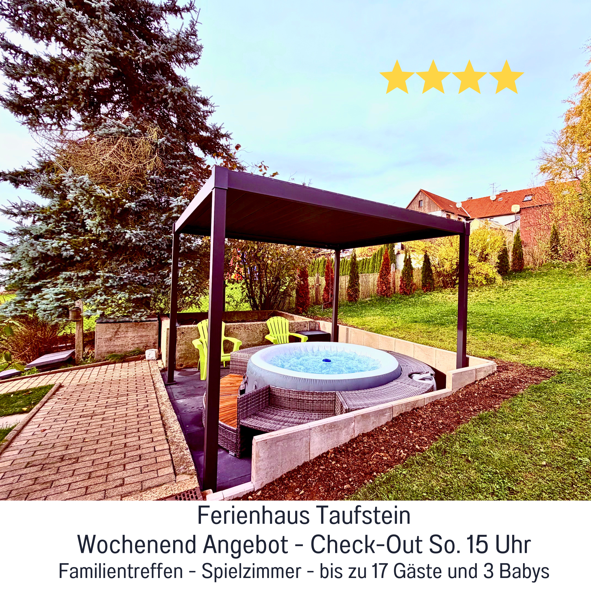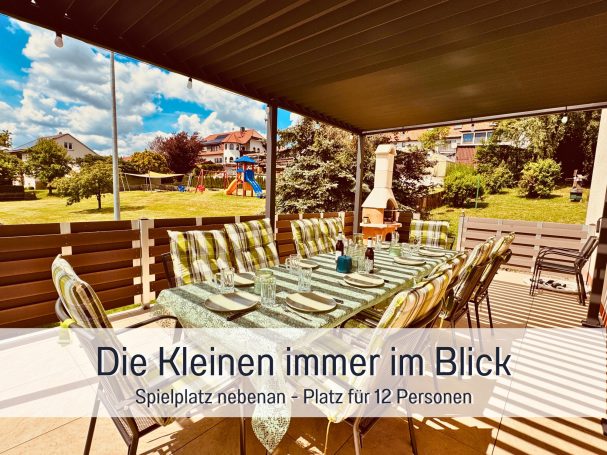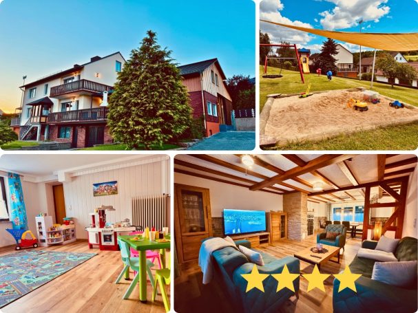 Das Ferienhaus Taufstein besteht aus 2 Doppelhaushälften 330 qm, 6 Schlafzimmer, bis zu 17 Gästen und 3 Babys und großem Garten